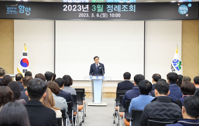 이날 정례조회는 국민의례, 친절교육, 군정소식 영상시청, 훈시말씀, 군민가 제창 순으로 진행하였다.
