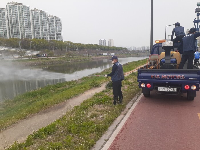 | ▲말라리아 매개 모기가 서식하기 쉬운 중랑천변에서 친환경 방역 활동을 실시하고 있는 모습(사진=중랑구청 제공) |