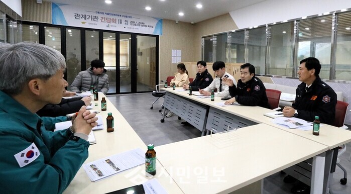 | ▲ 정용인 강진소방서장(오른 쪽부터 두 번째)이 이진희 강진군 안전정책팀장 등 관계기관 참석자들을 대상으로 간담회를 주재하고 있다. / 강진소방서 제공 |