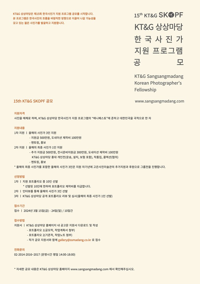 [시민일보 = 여영준 기자] KT&G 상상마당이 한국사진가 지원 프로그램 ‘제15회 KT&G SKOPF(Sangsangmadang Korean Photographer’s Fellowship)’의 참가자를 오는 24일까지 모집한다.