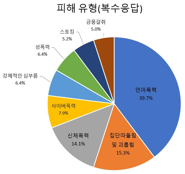 피해 유형으로는 언어폭력이 39.7%로 가장 많았고, 따돌림(15.3%), 신체폭력(14.1%), 사이버폭력(7.9%), 강제심부름과 성폭력(각 6.4%), 스토킹(5.2%), 금품갈취(5.0%) 등이 뒤를 이었다.