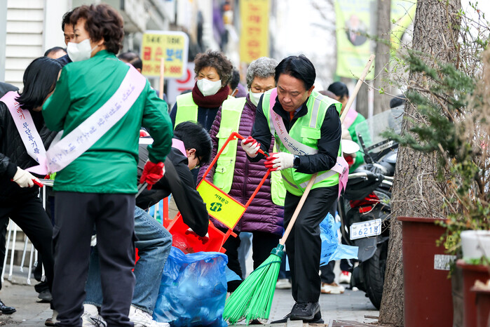 겨우내 쌓인 먼지와 쓰레기를 제거하고 청결 문화를 확산하기 위해 이 구청장과 함께 천연동 주민, 공무원, 환경공무관 등 100여 명이 참여했다.