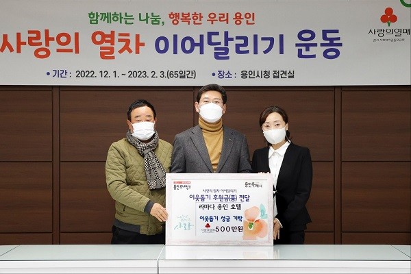 라마다용인호텔은 28일 용인시청에서 진행된 기부금 전달식을 통해 지난해에 이어 성금 500만원을 기탁했으며, 이 성금은 경기사회복지공동모금회를 통해 용인시 전대리에 거주하는 저소득 가정과 사회복지시설에 전달될 예정이다. 기부금 전달식에는 라마다용인호텔 전해연 대표이사와 전대리 정윤식 이장이 함께 참석했다.