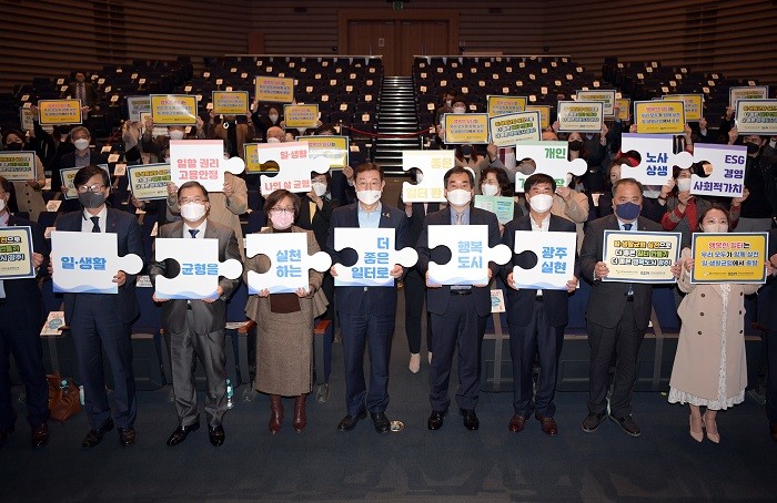 [광주=정찬남 기자] 이용섭 광주광역시장이 25일 오후 시청 대회의실에서 여성가족재단 주관으로 열린 일·생활균형 비전 선포식에 참석해 참석자들과 함께 손팻말을 들고 노사민관 실천 퍼포먼스를 하고 있다./광주광역시 제공
