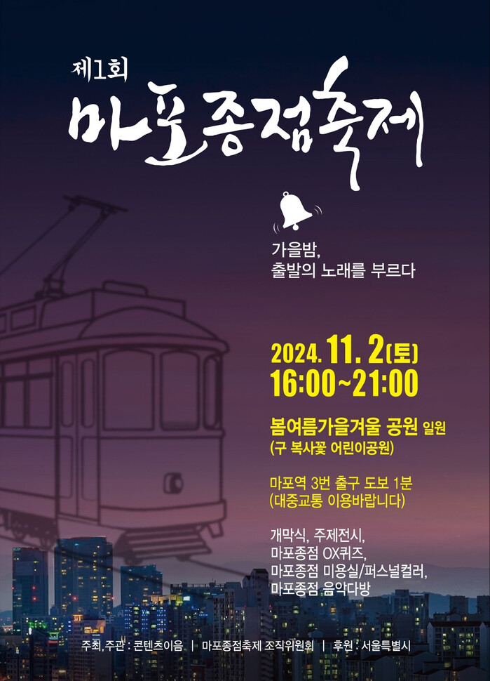 [시민일보 = 문민호 기자] ‘제1회 마포종점축제’가 11월2일 토요일 개최된다. 오후 4~9시 펼쳐지는 이번 축제는 마포종점추진위원회와 콘텐츠이음이 주최하고, 서울시와 마포구가 후원하는 행사 후원하는 행사로, 마포의 역사와 추억을 함께 나누는 자리가 될 예정이다.