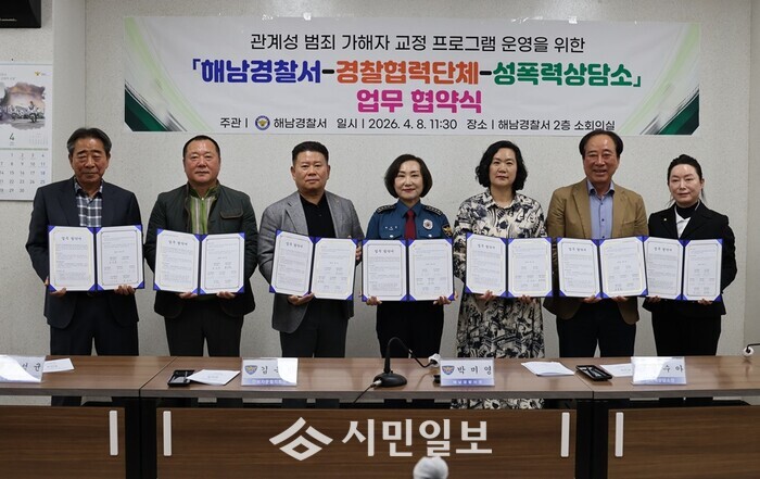 [해남=정찬남 기자] 전남 해남경찰서(서장 박미영)는 8일 해남경찰서 2층 소회의실에서 5개 경찰협력단체 및 해남성폭력상담소와 함께 관계성 범죄 가해자 상담·치료 프로그램 운영을 위한 업무 협약을 체결했다.