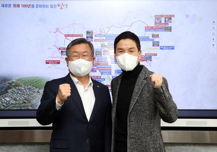 | ▲ 박일호 밀양시장이 밀양시 홍보대사인 배우 이상인씨의 셋째 자녀 출산을 축하하며 파이팅을 하고 있다. |