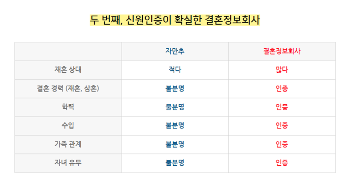 뿐만 아니라 실제 고객들의 후기를 통해 고객만족도가 높은지 체크해 봐야 하며, 자신이 거주하는 지역에서의 만남을 체계적으로 관리할 수 있는지 눈여겨보는 게 좋다. 회원을 위한 혜택도 꼼꼼히 확인해 봐야 한다. 또한 성혼비가 있는 결정사와 성혼비가 없는 결정사의 다른 점과 재혼정보회사를 선택할 때의 팁도 확인할 수 있다.