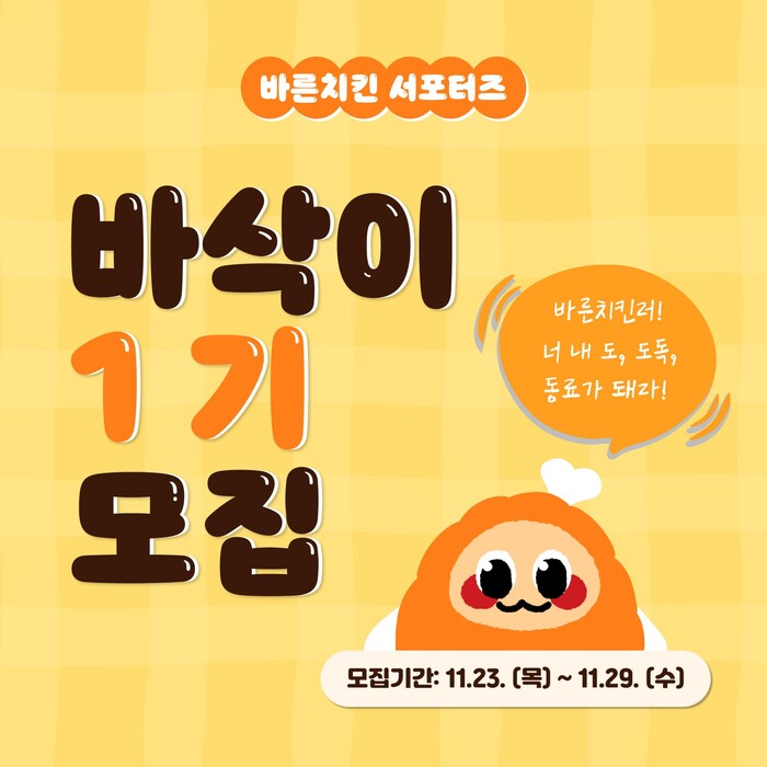 바삭이 1기 모집에 대한 자세한 사항은 바른치킨 인스타그램 혹은 홈페이지를 통해 확인 가능하다.