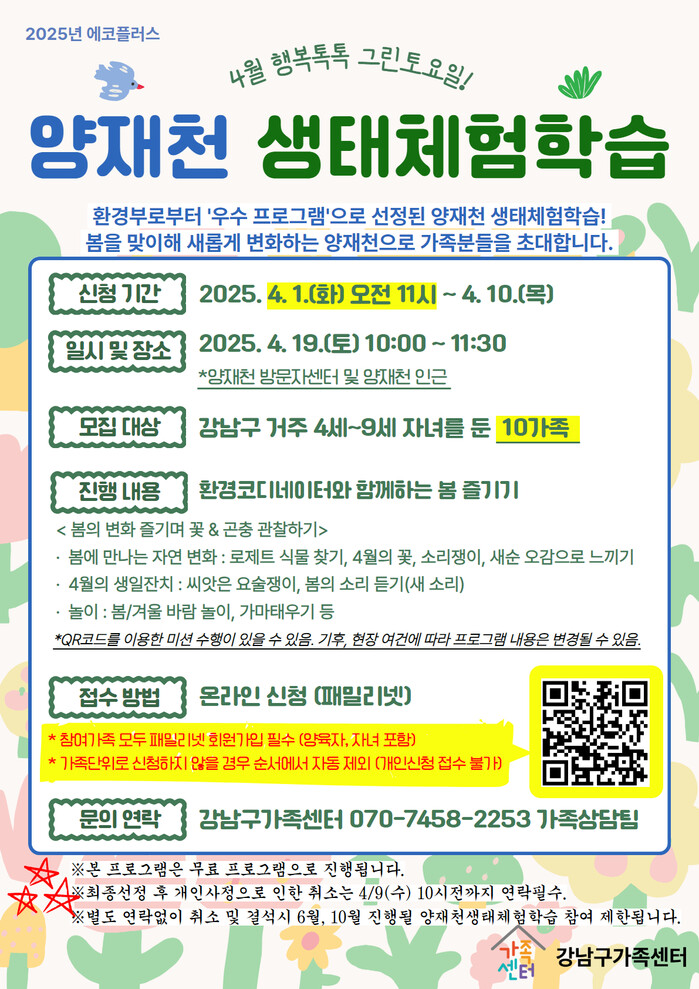 강남구가족센터는 환경을 매개로 가족 친밀감 증진을 위한 프로그램 <에코플러스>를 진행하고 있다. 올해도 양재천방문자센터와 함께 환경부의 ‘우수 환경교육 프로그램’으로 지정된 ‘생태체험학습 행복톡톡 그린토요일’을 통해 강남구 가족과 함께 양재천의 사계절을 만날 예정이다.