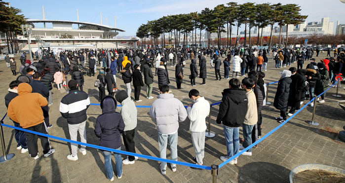 12일 오후 서울 마포구 월드컵공원 평화광장에 마련된 임시선별검사소 앞이 검사를 기다리는 시민들로 붐비고 있다. 중앙방역대책본부에 따르면 이날 0시 기준 코로나19 위중증 환자는 894명을 기록하며 기존 최다치인 지난 9일 857명보다 37명이 늘었다. 한편 신규확진자 수는 6689명으로 집계됐다.