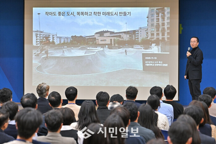 [광주=정찬남 기자] 광주 서구(구청장 김이강)는 13일 서구청 들불홀에서 강범준 교수를 초청해 ‘작아도 좋은 도시, 똑똑하고 착한 미래도시 만들기’ 주제로 직원 대상 강의를 개최했다./ 광주 서구 제공