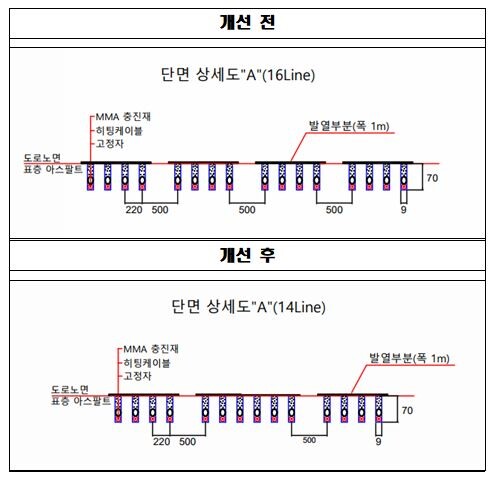 아울러 예산 절감을 위해 열선 설치 방법도 개선했다. 2차선 이면도로 등 폭이 좁고 중앙선 분리가 어려운 구간에는 평균 16줄의 열선이 설치되는데 이를 14줄로 줄이는 방식이다.