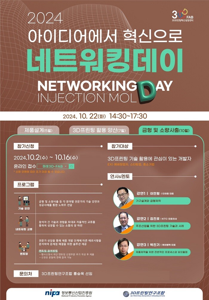 본 행사는 ‘티어원 이민형 대표’의 ‘기구설계와 금형제작’, ‘KTC 김진호 대표’의 ‘주조산업을 위한 3D프린팅 기술과 사례’, ‘케이엠텍 박진기 대표’의 ‘제품제작을 위한 전반적인 프로세스와 유의할점’으로 각 분야별 전문가를 초청하여 ▲기술강연을 시작으로 ▲참석자간 자율 교류와 ▲멘토링 프로그램으로 구성되어 있으며, 특히 멘토링 프로그램은 사전 신청자에 한해 전문가와의 1:1 컨설팅을 제공하여 제품 개발 및 제품화에 필요한 노하우와 공정 애로사항을 해소할 수 있는 자리로 마련될 예정이다.