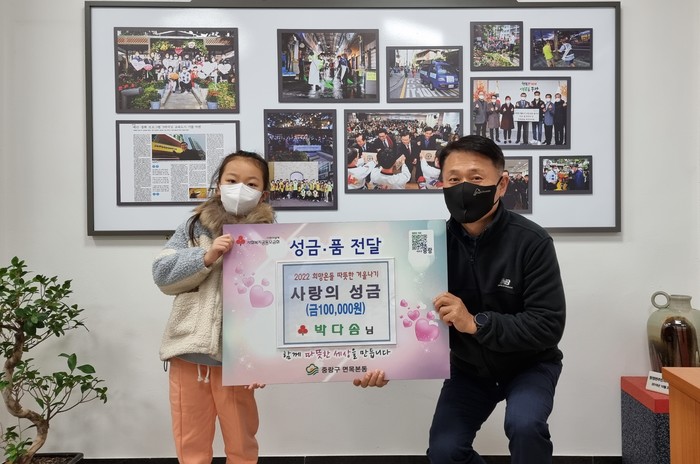 서울 중랑구 면목본동 주민센터에 이웃들의 기부 행렬이 이어지고 있다. 최근 1호 기부자 박다솜양(8)에 이어, 거제수협직판장과 바다의별어린이집으로부터 따뜻한 겨울나기 성금을 전달받았다. 사진은 박양이 희망온돌 따뜻한 겨울나기 성금을 기부하고 기념촬영을 하고 있는 모습. (사진제공=중랑구청)