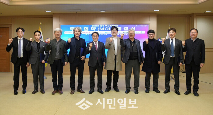 | ▲ 강기정 광주광역시장(사진 왼 쪽부터 다섯 번째)이 19일 오후 시청 비즈니스룸에서 2025년 광주 핵심전략산업 투자협약을 체결한 후 참석자들과 함께 기념촬영을 하고 있다. /광주광역시 제공 |