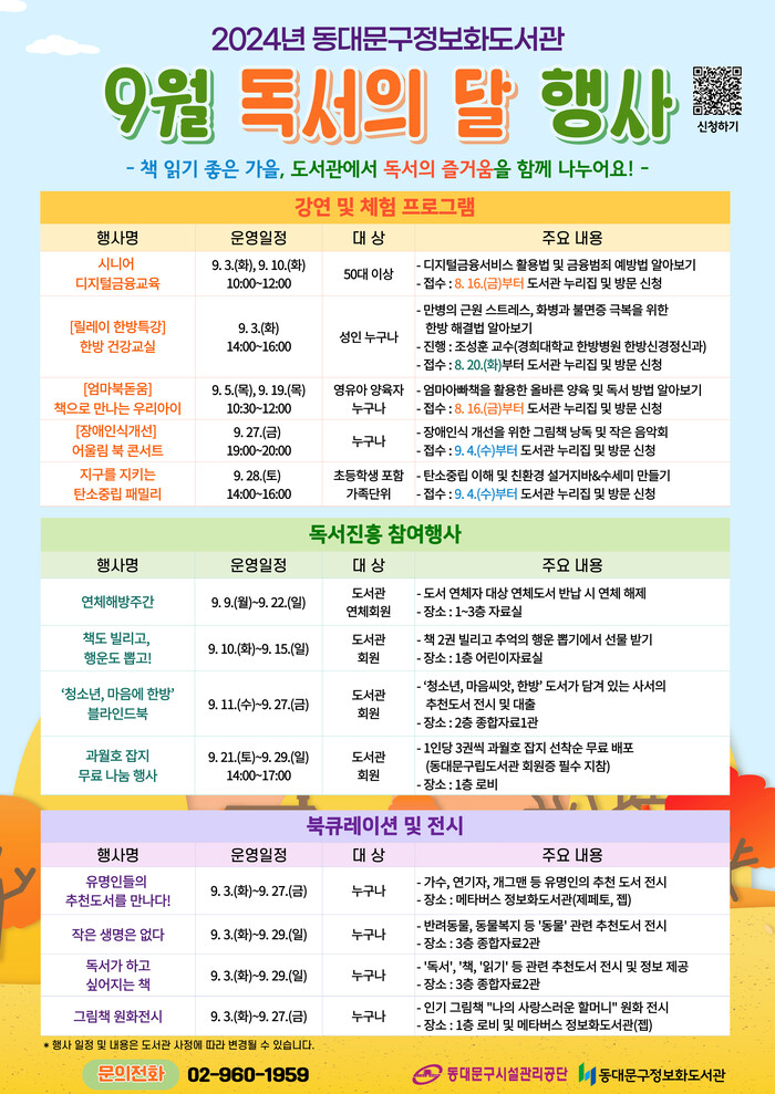 [시민일보 = 이대우 기자] 서울 동대문구시설관리공단에서 운영하는 동대문구정보화도서관이 9월 독서의 달을 맞이하여 “책 읽기 좋은 가을, 도서관 즐기기”라는 주제로 다양한 행사를 진행한다.