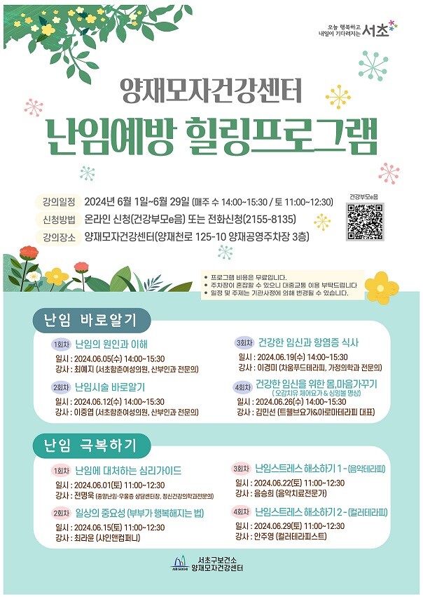 [시민일보 = 이대우 기자] 서울 서초구(구청장 전성수)가 양재모자건강센터에서 ‘전문가와 함께하는 행복한 임신, 난임예방 힐링프로그램’을 오는 29일까지 운영한다.