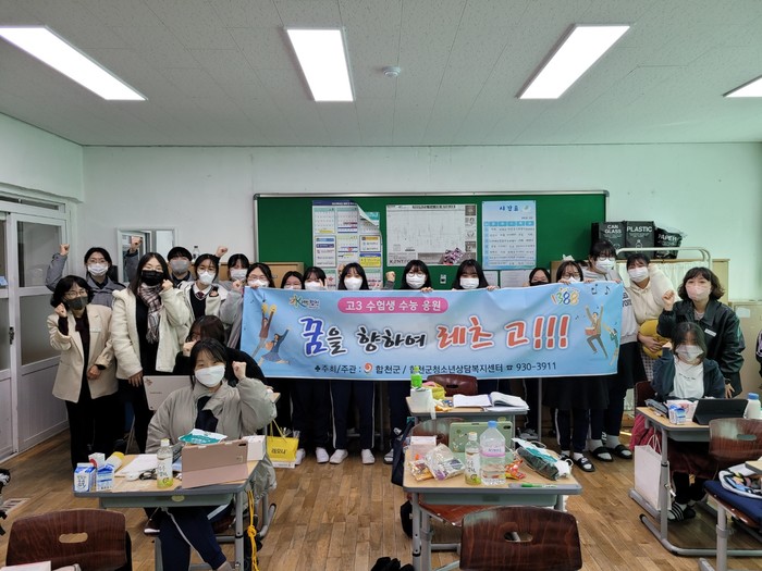 이번 「꿈을 향하여 레츠 고!!!」 활동은 수능 준비로 지친 수험생들의 몸과 마음을 위로하고자 마련됐다. 올해는 특히 관내에 있는 이노티 안경점에서 수험생을 위한 빵을 후원하며 응원의 손길을 더했다. 그리고 시험 당일에는 추운 날씨에 온기를 더하고자 관내 시험장소인 합천고와 합천여고 앞에 핫팩을 비치하여 비대면으로 배부할 예정이다.