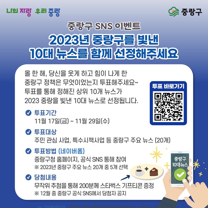 [시민일보 = 여영준 기자] 서울 중랑구(구청장 류경기)가 2023년 올해 중랑구를 빛낸 10대 뉴스를 선정하기 위해 오는 29일까지 투표를 진행한다.