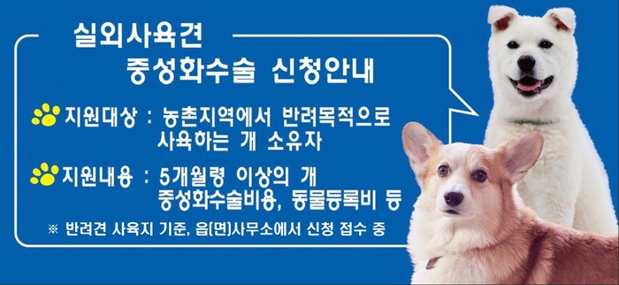 이번 사업은 실외에서 사육되는 반려견을 중성화해 관리 미흡으로 인한 무분별한 개체 수 증가를 막고, 유실·유기견 발생을 사전에 방지하기 위해 마련되었다.
