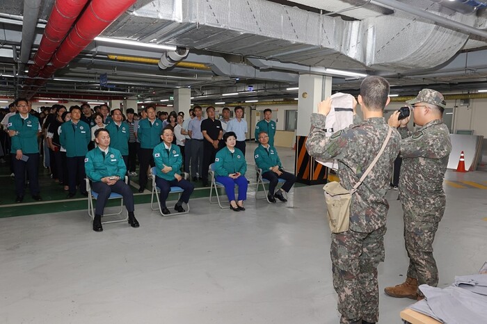 | ▲ 명현관 해남군수가 지난 22일 을지연습 실시된 해남군청 지하대피소에서 군부대 장병들의 방독면과 방호복 착용 방법 등의 교육을 받고 있다. / 사진, 앞줄 왼 쪽부터 첫 번째 손명도 부군수, 명현관 해남군수, 김미숙 기획실장, 최석영 총무과장 등 / 해남군 제공 |