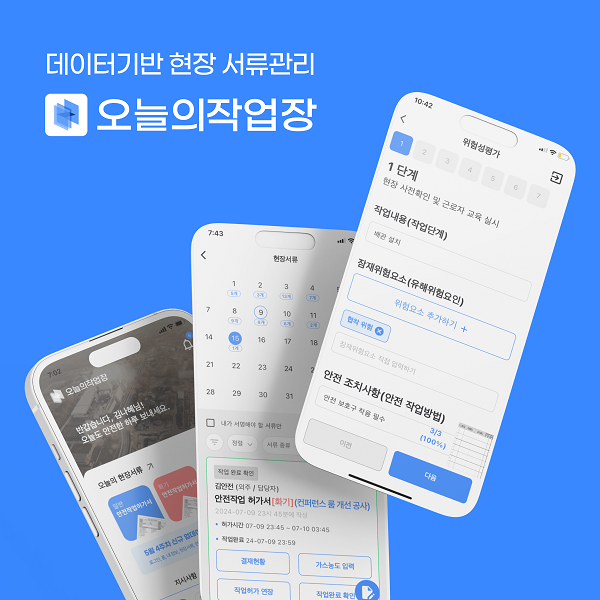 오늘의작업장의 플랫폼은 아날로그 방식의 서류 작성을 디지털화하여 안전작업허가서, TBM 회의록, 위험성 평가 등의 서류를 앱에서 간편하게 작성하고 웹에서 실시간으로 모니터링할 수 있다. 이를 통해 관리자들의 업무 효율성과 안전성을 극대화하며, 직관적인 인터페이스와 실시간 데이터 통합으로 현장 관리의 새로운 표준을 제시한다.