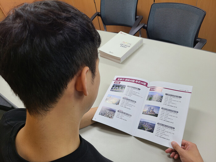| ▲ 도봉구 정비사업 안내 책자를 보고 있는 도봉구민. (사진=도봉구청 제공) |