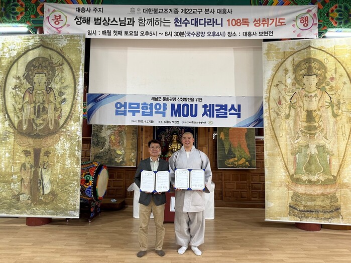 [해남=정찬남 기자] 전남 해남문화관광재단(대표이사 이병욱)과 대한불교조계종 제22교구본사(주지 법상)은 지난 17일 대흥사 보현전에서 지역 관광·문화 교류 협력을 위한 업무협약을 체결했다. 두 기관은 업무협약을 통해 지역 관광과 문화자원을 활용한 지역 브랜드 강화에 나서기로 하고 양 지역 관광·문화 발전을 위한 네트워크를 구축하기로 했다.