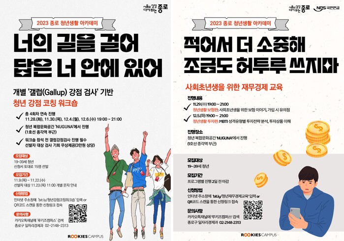 [시민일보 = 이대우 기자] 서울 종로구(구청장 정문헌)가 오는 28일~12월6일 청년들의 인생 설계 및 삶의 방향성 설정에 도움을 ‘2023 종로 청년생활 아카데미’를 운영한다.