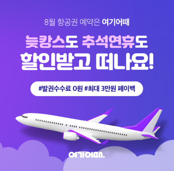 여기어때는 이날부터 추석 연휴에 비행하는 해외 항공권을 예매하면, 3만 포인트를 지급하는 행사를 연다. 해외 항공권 예매시 자동 응모 되며, 총 100명을 추첨할 예정이다. 이와 함께 해외 숙소 전용 총 40만원 쿠폰 묶음도 발행한다.