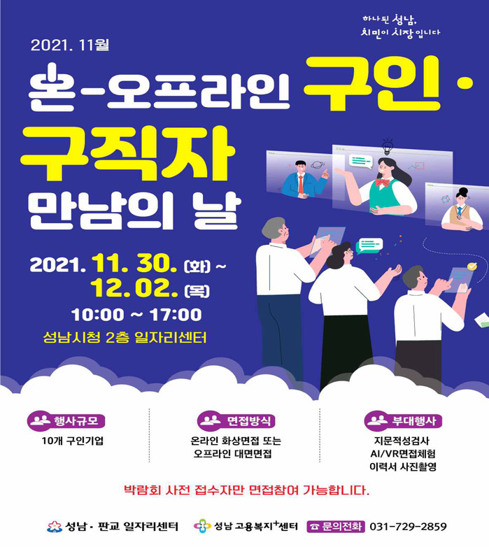 [성남=오왕석 기자] 성남시는 11월 30일부터 12월 2일까지 3일 동안 시청 2층 성남일자리센터에서 화상 및 대면 면접으로 취업을 알선한다.