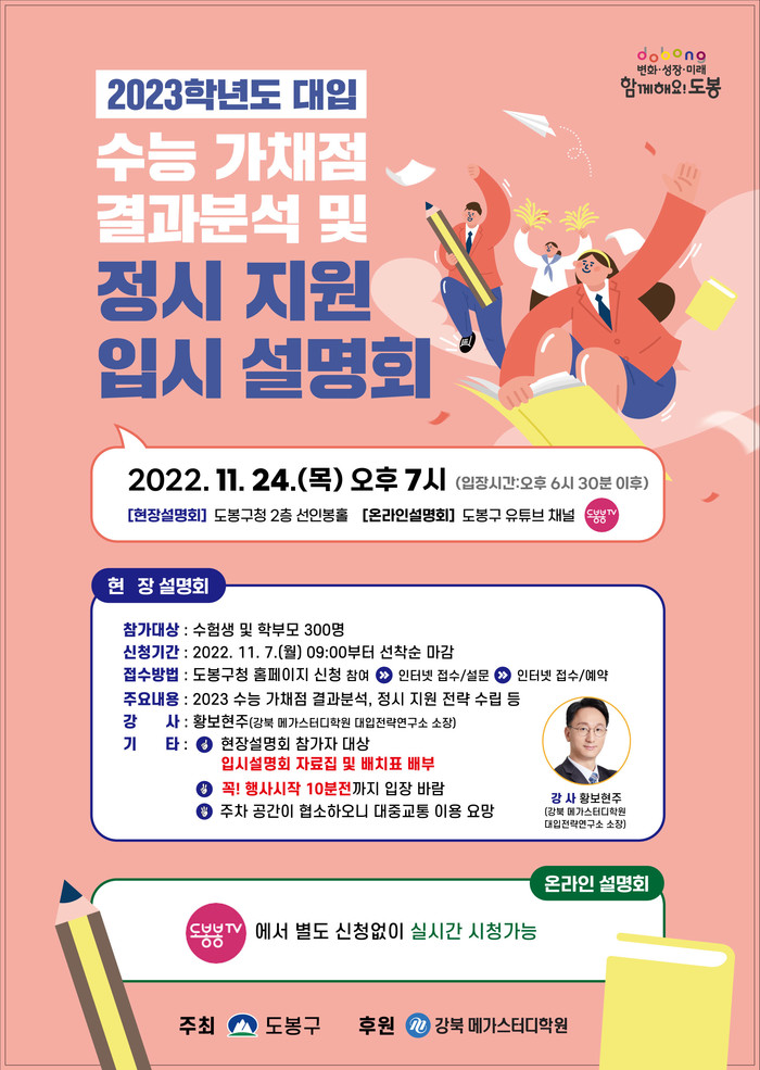 [시민일보 = 박준우 기자] 서울 도봉구(구청장 오언석)가 수험생과 학부모들을 위해 '2023학년도 대입 수능 가채점 결과분석 및 정시 지원 입시 설명회'를 연다고 18일 밝혔다.