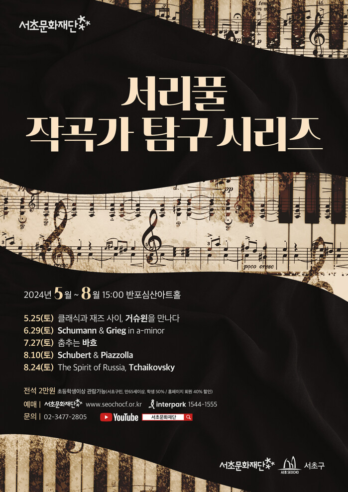‘2024 서리풀 작곡가 탐구 시리즈’는 세기에 걸쳐 명작을 남긴 거슈윈, 슈만, 그리그, 바흐, 코렐리, 슈베르트, 피아졸라, 차이콥스키 등 친숙하면서도 개성 있는 작곡가들을 만나는 시간으로 국내 최고의 연주자들 초청하였다. 오는 8월 24일까지 서초문화재단 반포심산아트홀에서 진행된다.