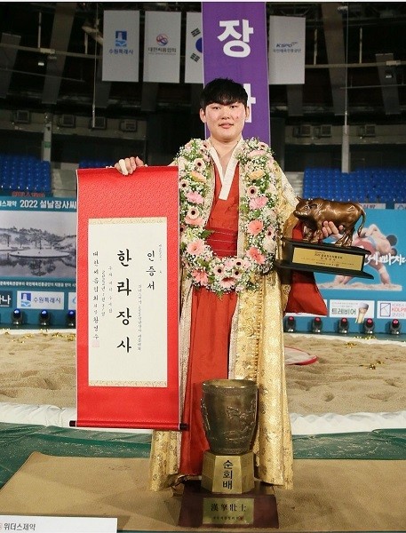 | ▲ 2022년 수원특례시 설 장사씨름대회에서 한라장사에 오른 오창록 영암군민속씨름단 소속 장사 / 사진=영암군 제공 |