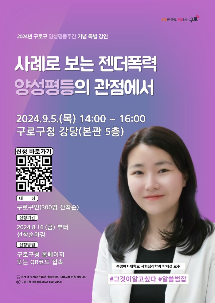 [시민일보 = 박소진 기자] 서울 구로구(구청장 문헌일)가 양성평등주간을 맞아 9월 5일 오후 2시에 구로구청 강당에서 특별강연을 진행한다.