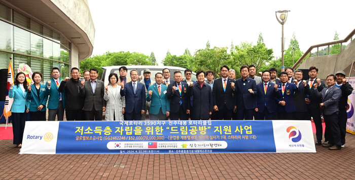 이번 기탁은 저소득층 주민의 일자리 마련과 소득증대를 돕기 위해 마련됐으며 진주대봉로타리클럽과 국제로타리 3502지구 대만 도원 복흥 부륜사 로타리클럽은 저소득층 주민의 일자리 창출 지원을 위한 글로벌 임바운드 ‘드림공방 지원사업’에 스타리아 밴 차량 1대와 사업장비(공업용 재봉틀 6대, 패브릭출력기 1대)등 물품을 지원했다.