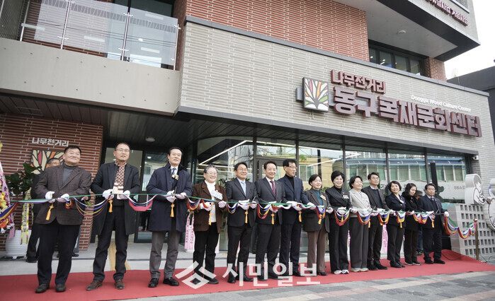 [광주=정찬남 기자] 강기정 광주광역시장((왼 쪽부터 다섯 번째)이 10일 동명동 동구목재문화센터 개관식에 참석해 테이프 커팅을 하고 있다. 동구목재문화센터는 주민 누구나 일상에서 생활 목공 문화를 체험할 수 있는 복합문화공간으로, 도시재생뉴딜사업으로 추진됐다. /광주광역시 제공