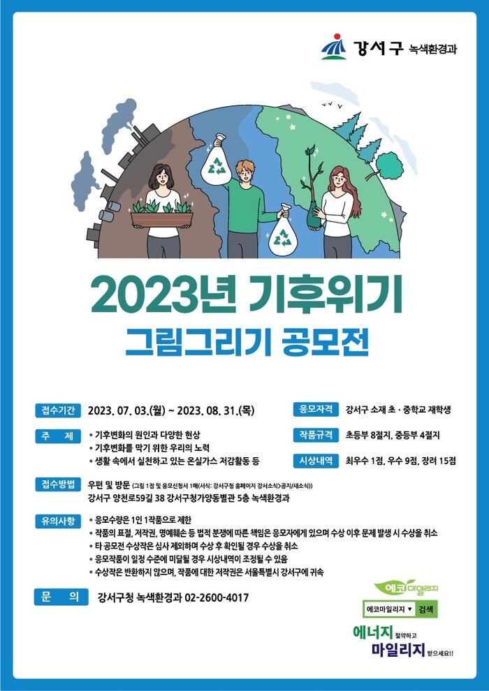 [시민일보 = 홍덕표 기자] 서울 강서구가 지구온난화, 온실가스 등 기후위기에 대한 관심을 높이기 위해 지역내 초등학생, 중학생을 대상으로 3일부터 오는 8월31일까지 '2023년 기후위기 그림그리기 공모전'을 개최한다.
