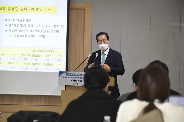 | ▲ 문석진 구청장이 올해 2월17일 서울시청 브리핑룸에서 ‘영 케어러 돌봄 사업’에 대해 프레젠테이션하는 모습. (사진제공=서대문구청) |