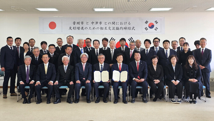 이날 협약식에는 조규일 시장을 비롯한 6명의 진주시 대표단과 오쿠즈카 마사노리 나카츠 시장, 사가라 다카노리 나카츠시 시의회 의장, 안도 모토히로 한일친선협회 명예회장 등 40명이 참석했다.