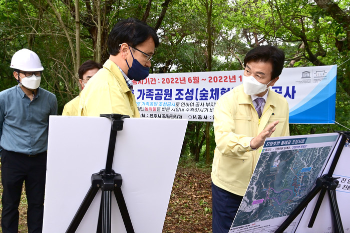 조규일 진주시장은 지난 8일 ‘진양호 르네상스 프로젝트’의 하나로 추진 중인 ‘진양호 가족공원 조성사업’ 대나무숲산책로 및 숲체험놀이장 조성 사업지를 방문해 현장을 점검하고 관계자들을 격려했다.