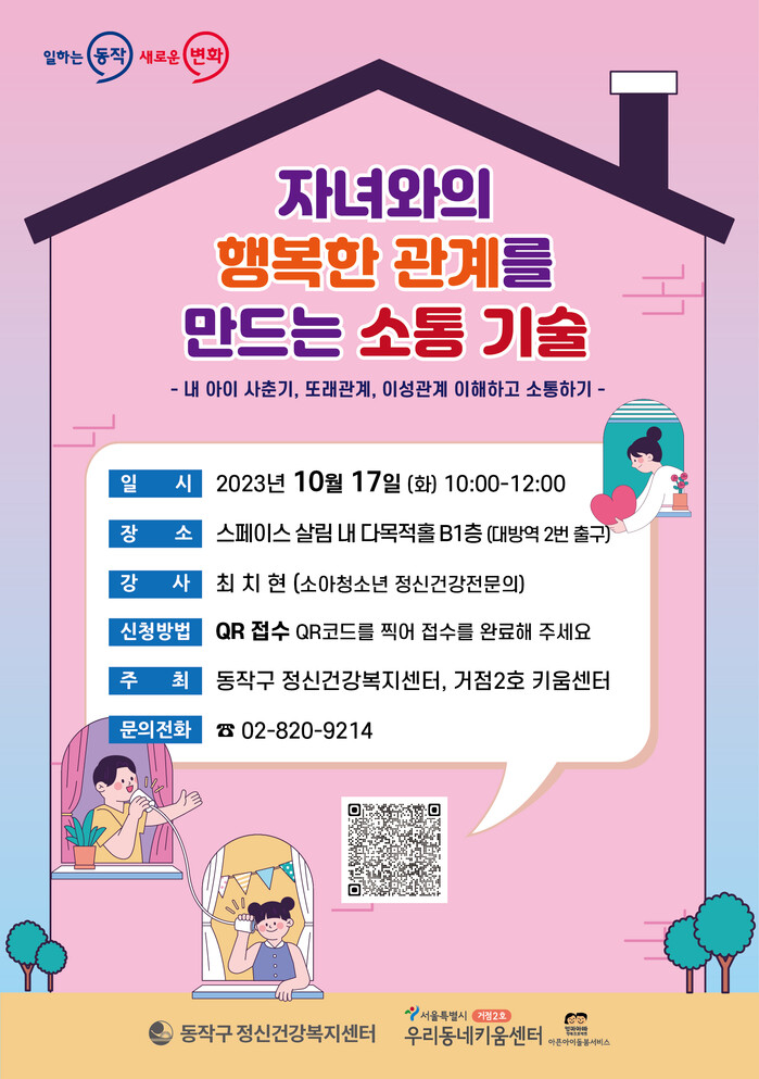 구에 따르면 10월17일 오전 10시 스페이스 살림(대방역 2번 출구)에서 소아·청소년 정신건강의학과 전문의를 초청해 ‘자녀와의 행복한 관계를 위한 소통 기술’라는 주제로 강의가 열린다.