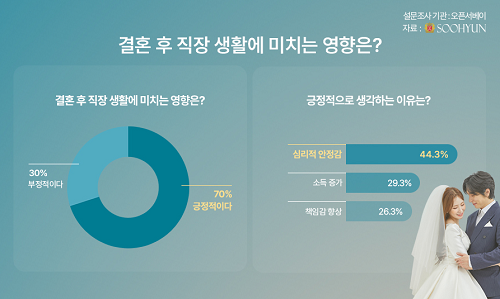 결혼이 직장생활에 ‘긍정적이다’라고 선택한 이들에게 ‘결혼이 직장생활에 긍정적이라고 생각한 이유는 무엇인가요?’를 물었다. 이에 대해 다수의 응답자가 ‘심리적 안정감(44.3%)’을 선택했으며, ‘소득 증가(29.3%)’, ‘책임감 향상(26.3%)’을 이유로 꼽았다.