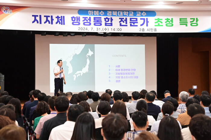 ‘미래 환경변화와 지방 행정체제 개편, 지방 중소도시의 대응’이란 주제로 진행된 이날 특강에서 하 교수는 “학령·청년 인구의 급감, 20대 젊은 층의 수도권 블랙홀, 신사업의 대도시 쏠림, 교통통신의 발달 등으로 인구 유출이 심각해지는 가운데 지방 중소도시가 소멸하지 않고 살아남기 위해서는 지자체 통합이 최선의 대안”이라고 강조했다.