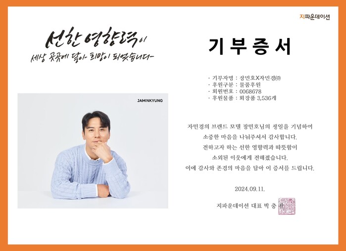 자민경 관계자는 “가수 장민호를 모델로 선정한 이후 많은 사랑을 받아 감사한 마음으로 기부를 진행하게 되었다. 소외된 이웃들에게 작은 행복이 될 수 있길 바란다.”며 “앞으로도 자사 제품을 통해 꾸준히 기부 활동을 이어가겠다.”고 밝혔다.