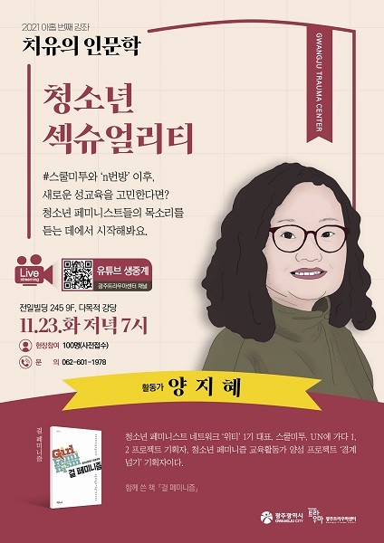 11월 치유의 인문학은 코로나19 사회적 거리두기에 따라 현장인원을 100명 이내로 제한하며, 유튜브 채널 ‘광주트라우마센터’로 생중계된다. 자세한 내용은 광주트라우마센터 홈페이지를 참조하면 된다.