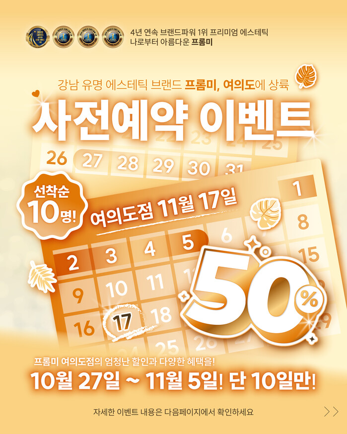 현재 프롬미는 여의도점을 포함해 전국 18개 지점을 운영 중이며, 평균 10년 이상 경력의 전문진과 프라이빗 1~2인실, 100% 일회용 비품, 비건 인증 자체 제품을 통해 위생적이고 프리미엄한 에스테틱 서비스를 제공하고 있다.