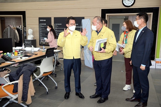 [광주=정찬남 기자] 문영훈 광주광역시 행정부시장이 28일 오후 서구청 선별진료소와 광산구청방역대책 종합상황실을 방문해 관계자로부터 방역대책 현황을 보고 받은 후 근무자들을 격려하고 있다. /광주광역시 제공
