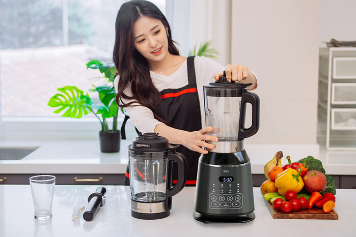 로엘전자의 보스 블렌더는 진공 블렌딩과 가열 블렌딩 모두가 가능해 시원한 음료부터 따뜻한 음식까지 조리할 수 있는 주방가전이다. 35,000RPM 속도의 강력 모터와 스테인리스 소재의 6중 입체 분쇄날이 조합되어 식재료의 영양을 보존하면서 섬유질 입자를 곱게 갈아낼 수 있다.